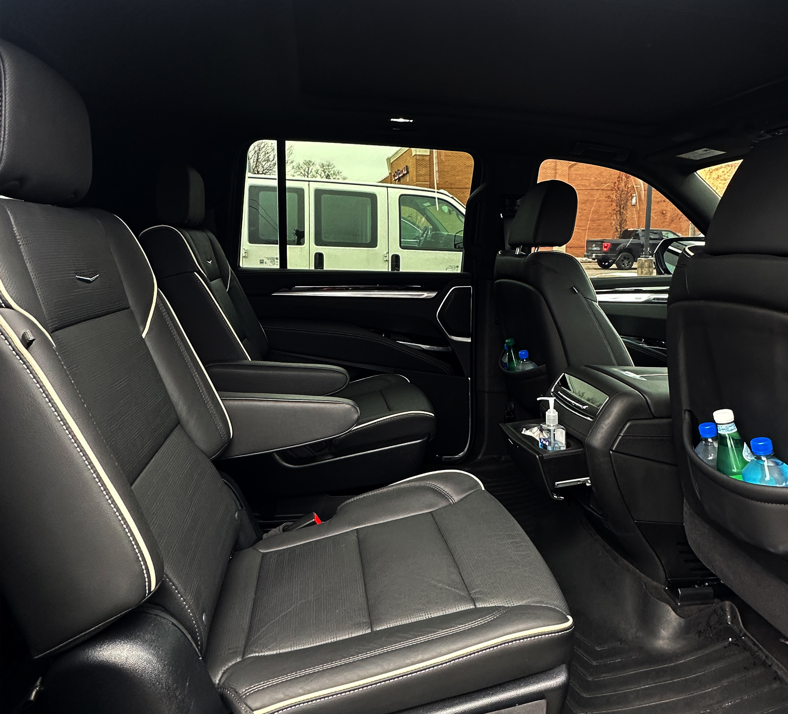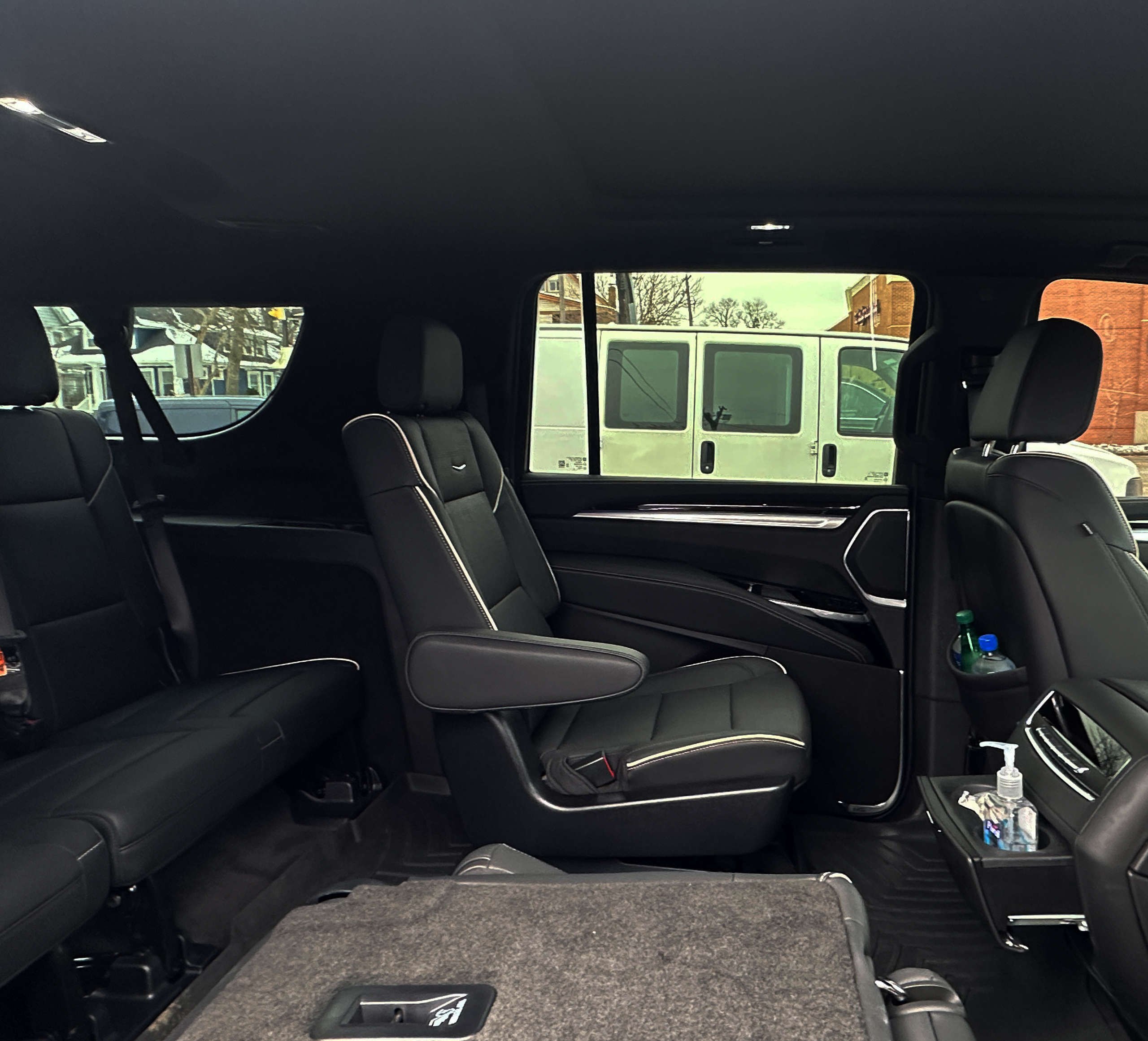 This spacious and elegant vehicle has a seating capacity of up to 6 passengers not including your chauffeur. This luxury SUV is equipped with tinted windows, reclining heated captain seats in the second row, reading lights, 110V outlet and USB ports, Panoramic Sunroof, dual rear-seat entertainment screens, and much more. Also included in this vehicle are complimentary water and sparkling water.